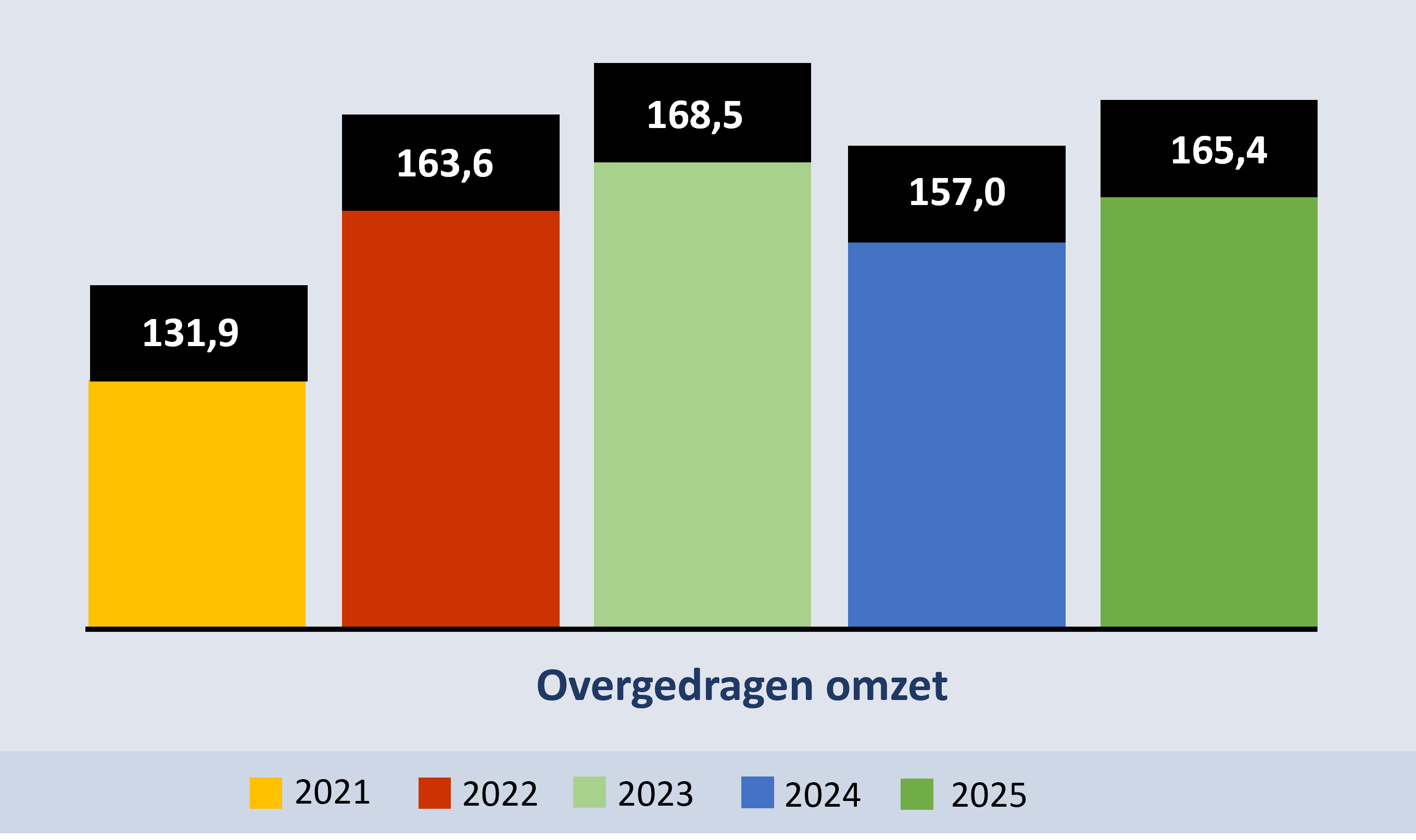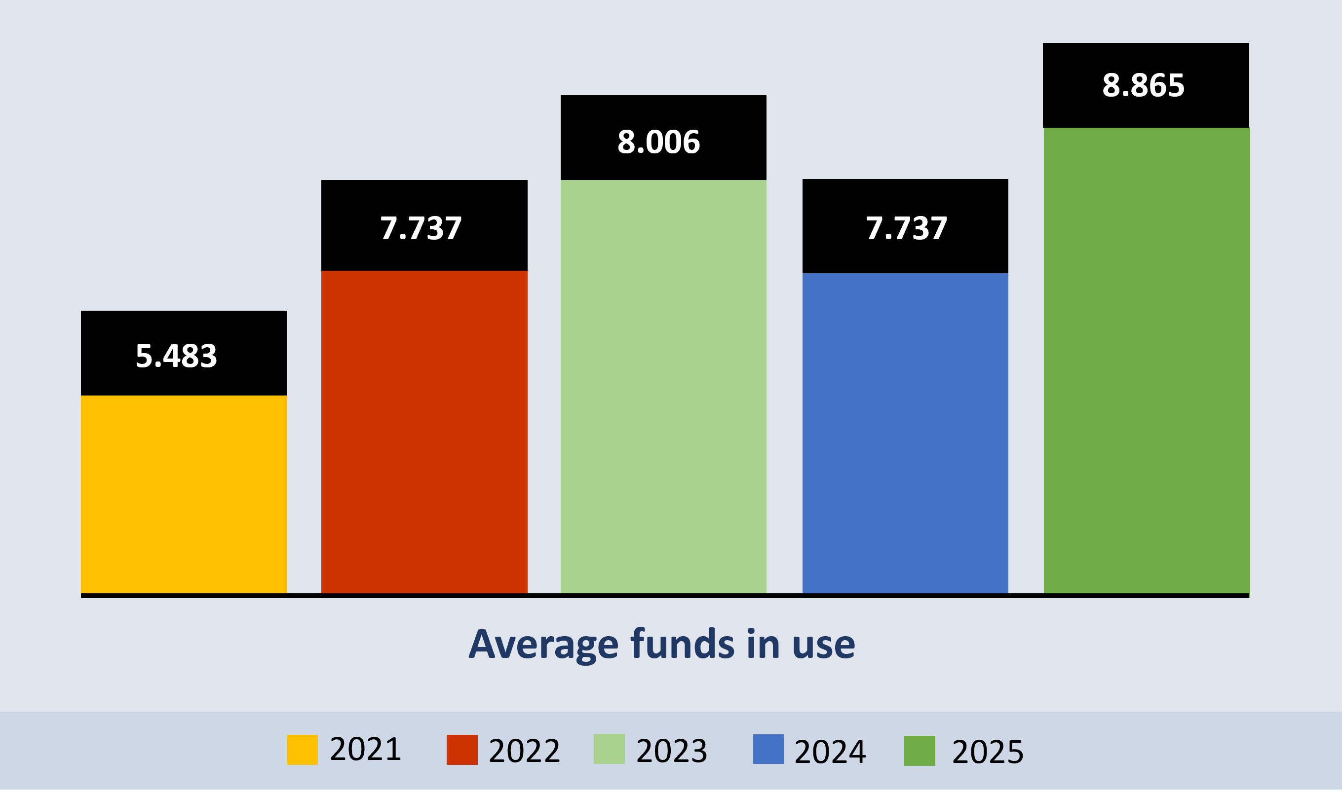 De average funds in use (gemiddelde gehele kalenderjaar) laten in 2025 ten opzichte van 2024 een forse stijging zien van 14,6% en komen uit op ruim 8,8 miljard euro.